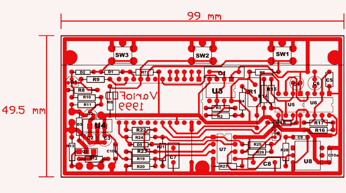 Here is the copper pattern for the printed circuit. As all my PCBs, this one is seen from the components side, so, if you print it out on transparent material, you can place it ink-down on your PCB material. Exact dimensions are given, to avoid any doubts. Depending on your software, you may have to scale the print to end up at the proper size.