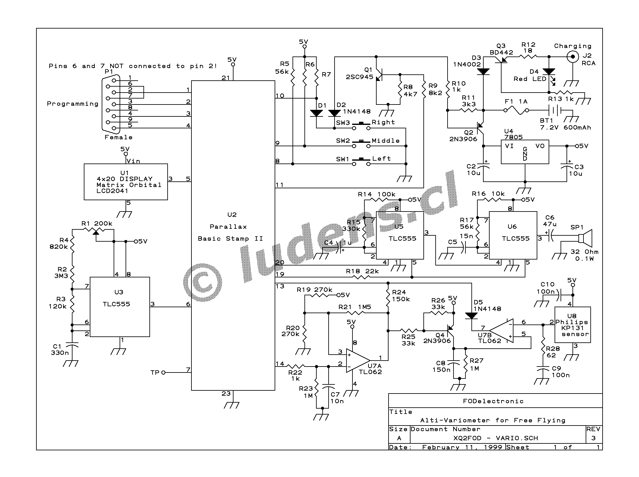 U3 is there for a quite silly reason: The Basic Stamp provides no timing function that could be used while doing other work. But I need timing, both for variometry calculation and for the flight time counter (an unnecessary, but useful function). So I added U3 as a 1-second timer. The entire software is synchronized to this external clock. While a quartz oscillator and divider would have been more precise, a carefully adjusted 555 timer is OK for this application.