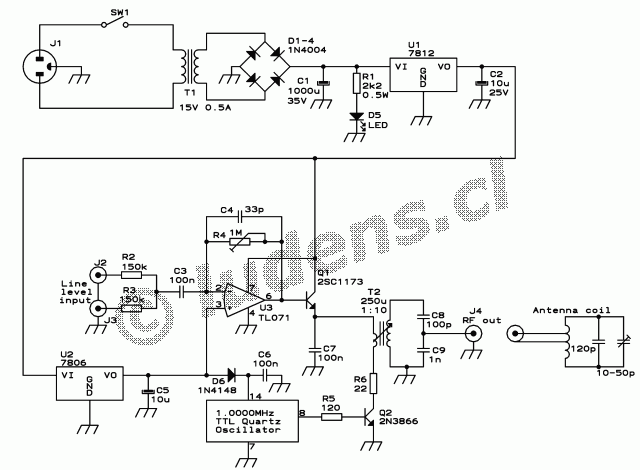 The modulation part is equally bare-bones-simple: Two input jacks accommodate stereo signals, which are simply added to form the mono signal needed to modulate the transmitter. A trimpot allows to adjust the modulation level. Setting it to the middle of its range will provide correct modulation depth with a typical line level signal, as provided by most CD players. The audio adder drives a power transistor, which modulates the supply voltage to the RF transistor. That's pretty much all there is to it... Add a standard regulated 12V power supply, and an additional 6V regulator to bias the modulator and to power the TTL oscillator, and that's the whole circuit.