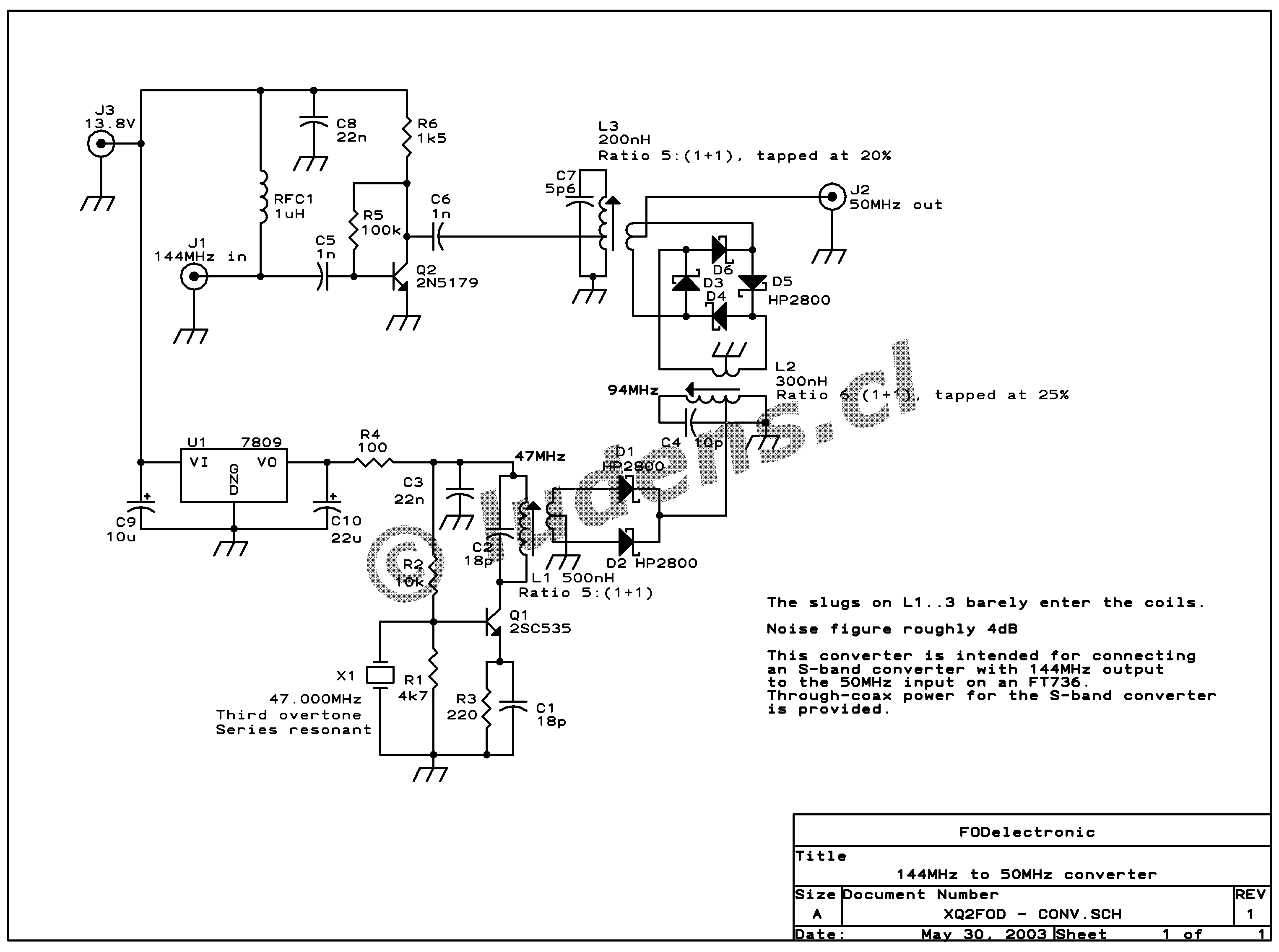 At first I fed the 144MHz signal into the 2m portion of the radio. It worked well enough, but the input noise figure of the FT736 is such that it did have a noticeable effect on overall noise figure. More gain was necessary in front of the radio, despite the fact that the DB6NT converter already has a healthy amount of gain! So I put my original plan into practice, and built a 144MHz to 50MHz converter with a noise figure lower than the FT736. Using it, I have now all four satellite bands available under computer control, and the noise figure is set by the converter to well below 1dB.