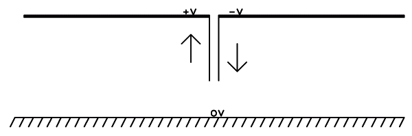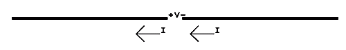 La tensión se aplica obviamente entre los dos polos, y en este caso no tiene sentido hablar de tensión absoluta, ya que no hay otros objetos cercanos. Entonces sólo tenemos una tensión relativa, entre los dos polos de la antena, que en este dibujo la indiqué con "+V-". La corriente que circula es de la misma magnitud en los dos polos de alimentación, saliendo de uno y entrando en el otro, y la indiqué mediante flechas. Estas condiciones valen durante un semiciclo, para invertirse las polaridades y direcciones en el siguiente semiciclo.