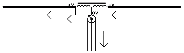 Queda claro a primera vista que con esta conexión la malla del cable coaxial queda efectivamente en el punto medio de la antena, que es un punto que no existía antes de poner el balun. Debido al buen grado de acoplamiento entre las bobinas del balun, cualquier tensión que aparezca en el vivo del coaxial, aparecerá con signo opuesto en el otro polo de la antena. La corriente que circula por el lado derecho de la antena pasa por la mitad derecha del balun y baja por la malla del coaxial, y es compensada por otra corriente igual que circula por la mitad izquierda del balun, proveniente del polo vivo del coaxial. Al mismo tiempo hay otra corriente igual que circula directamente desde el vivo del coaxial hacia el lado izquierdo de la antena.