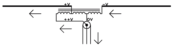 - Como los dos bobinados presentan una alta impedancia a cualquier corriente de RF que quiera circular para el mismo lado en ambos, sólo circula una corriente de modo común despreciable si por cualquier motivo aparece una tensión de RF entre el extremo superior y el inferior del balun.