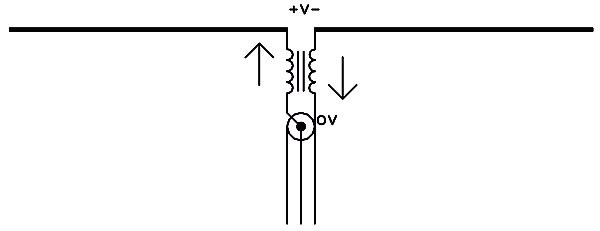 Está clarísimo que en este circuito la corriente del vivo del coaxial tiene que ir al lado izquierdo de la antena, y la corriente que sale del lado derecho tiene que bajar por la malla del coaxial. No hay otro lugar donde puedan ir! Pero a pesar de ello, este circuito dista mucho de ser una conexión directa del cable a la antena. El efecto de este transformador, conectado de tal manera, es el siguiente: