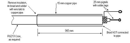 Si necesitamos un balun 1:1 hecho con el cable coaxial, podemos construir uno del tipo llamado "bazooka", como lo muestra este esquema tomado del sitio web de G8OSN. Sencillamente se conecta el cable coaxial directamente a la antena, pero además se instala un tubo metálico sobre el cable, que por abajo (izquierda, en este dibujo) va conectado a la malla del cable, y arriba termina sin conexión. El tubo deberá montarse en posición tal que quede sólo la mínima cantidad posible de cable saliendo de él, y su longitud debe ser de un cuarto de onda en la frecuencia de operación. Hay un detalle un poco problemático con este cuarto de onda, ya que debe ser calculado según el factor de velocidad que reina en el espacio dentro del tubo, y por fuera del cable coaxial. Este factor de velocidad depende del material y del espesor del aislante exterior del cable coaxial, y de la relación de diámetros, puesto que mientras más aire exista entre el tubo y el cable, más alto será el factor de velocidad. Como esto es difícil de calcular en forma precisa, lo mejor es medirlo en la práctica, o bien sacarle el aislante exterior al cable coaxial, en la parte que va dentro del tubo. En ese caso quedamos con factor de velocidad unitario. Si se le saca el forro, obviamente hay que tomar las precauciones del caso para que la malla no se abra, y para que la malla no toque el tubo. Es un problema.
