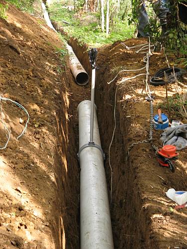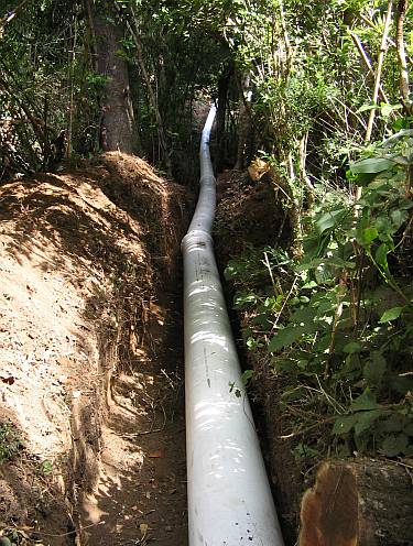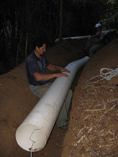 Meanwhile, work on the penstock installation continues. Gabriel provisionally put the tubes in the trench, to see how they fit. Here is the first tube, beginning right where the forebay will be. I asked him to make the trench a bit deeper here, because as shown there wouldn't be enough water over the tube.
