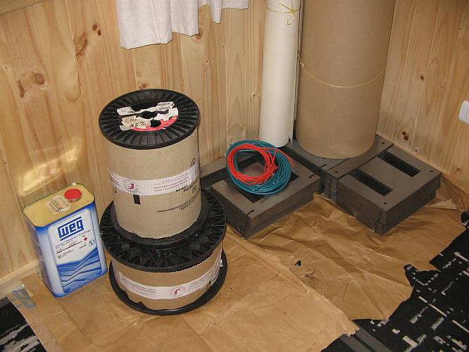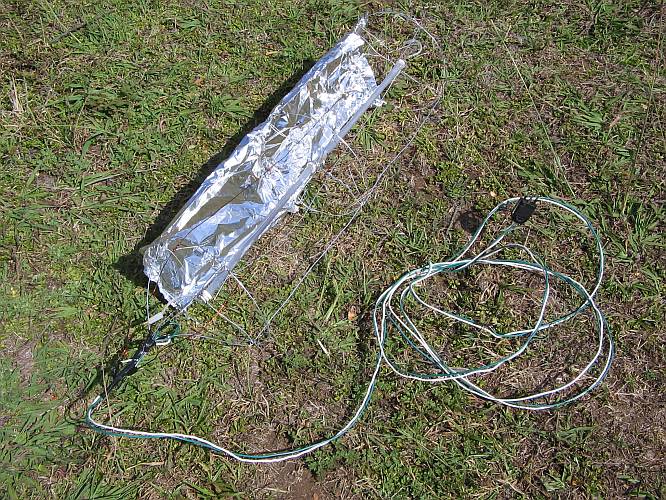 Now the final installation of the pipe can start! It has to be connected using rubber rings, and it has to be bent in many places. To bend this kind of pipe, many people use blowtorches. This is a quick method, but a dangerous one! It's easy to burn a hole into the pipe, or at least severely deform it. It's also possible to cause a fire. So I invented a PVC pipe bender. It consists of two electric quartz heating elements of 500 watts each, installed in a wire cage that slides into the tube. An aluminium foil reflector keeps 1/4 of the pipe circumference cool, to act as a stiff hinge, while the rest of the pipe will soften, in a length of about one meter.