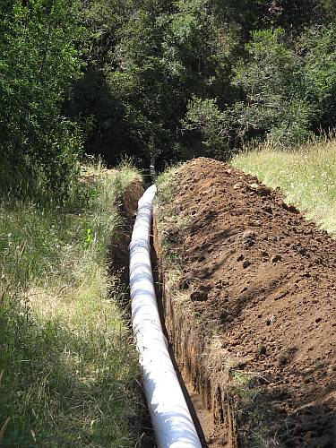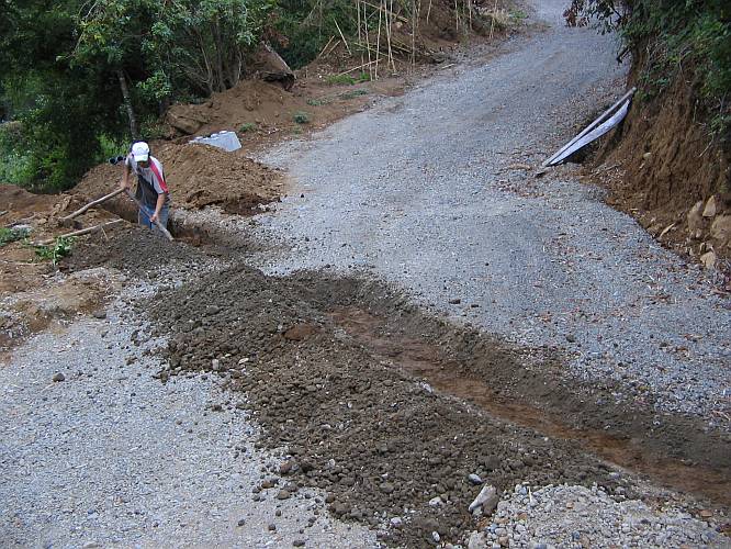 And soon we were at the point where the pipe had to cross the road. My valiant helpers dug a trench through the road, we installed the pipe there, and then they closed the trench, all within two hours, so that we didn't cause an excessive interruption to the truck traffic going to the house construction site! Everything is running concurrently here!