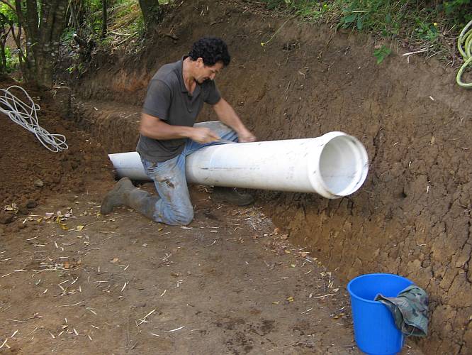 When I bought the plastic tubes, I bought a few extra, just to be sure I had enough. I had measured the distance by GPS only, because at the time I bought the tubes, it was not yet possible to get through the jungle by the exact path the penstock had to take. As we advanced with the work, at times it looked like even this excess would not be enough! Then again it looked like only one length of tube (from a total of 84) would be left over. Finally, we finished just right, with all tubes being used, and only one and a half meters of the last piece left over! Here Gabriel is cutting off the only little piece that is left! Murphy lost the game, one time at least!