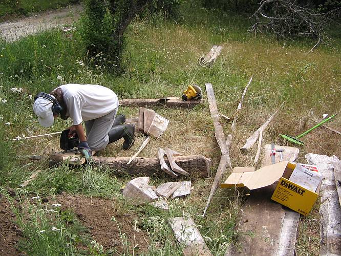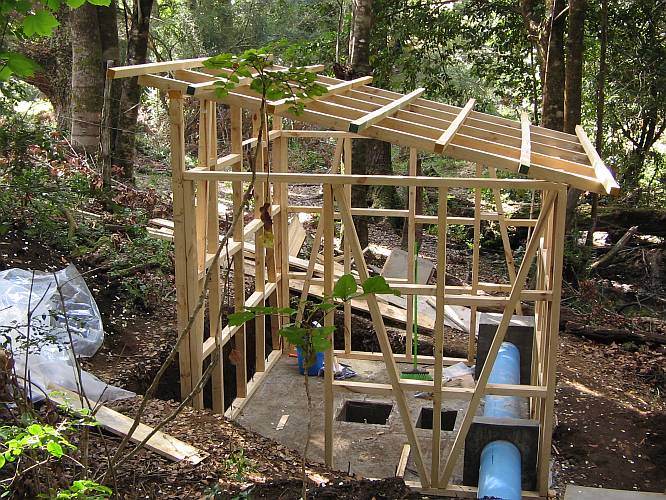 After the concrete had set, I built the power house on it. Here you can see the finished structure. All wooden pieces were cut to size at my little cabin, then hauled to the site and assembled there. Incredibly enough, they actually fit! :-)