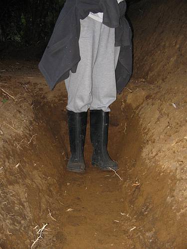 This is as far as we got until now. Work continues. The trench now has to cross the road, then go through a long stretch of grassland with constant slope and easy terrain, then it has to cross the stream on a wooden bridge we have to build, and then the real fun starts: Running it through forest so dense that it's hard to climb through!