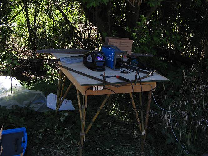 Gabriel took a well-deserved week off, and in the meantime I'm doing some steel work. Here the frame for the trash rack is about to be welded together.Note the special model table! Its top is a leftover from building the transport structure for my flying machine, two sides are leftovers from building the big box I use in the car, while the other two sides are scraps left from building my kayak. And the bamboo legs are locally grown!