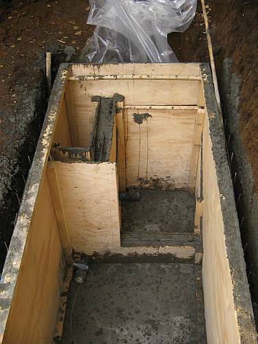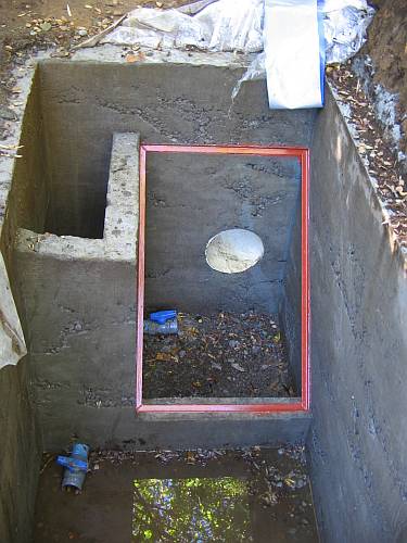 After allowing the concrete to harden for a week, the molds were removed. This was really difficult! The molds inside the overflow chamber had to be burned through with a blowtorch, not easy at all with wood totally soaked by the wet concrete and the rain!