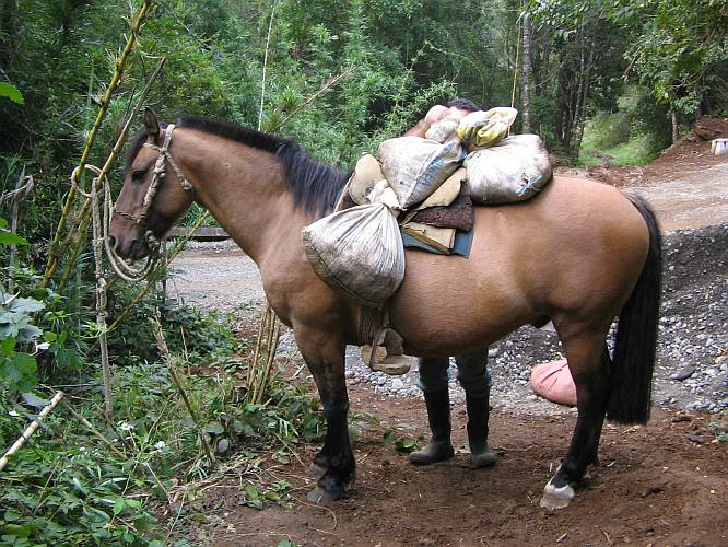 My largest fear was how to haul all the gravel, sand and cement in. Here we needed slightly more material than for the power house, and the trail to this place is steep uphill. Not even Gabriel could push a wheelbarrow full of stones up this trail! Ever resourceful, he went to his land (neighboring mine) and came back with the perfect tool for this task: His horse, and some sacks.