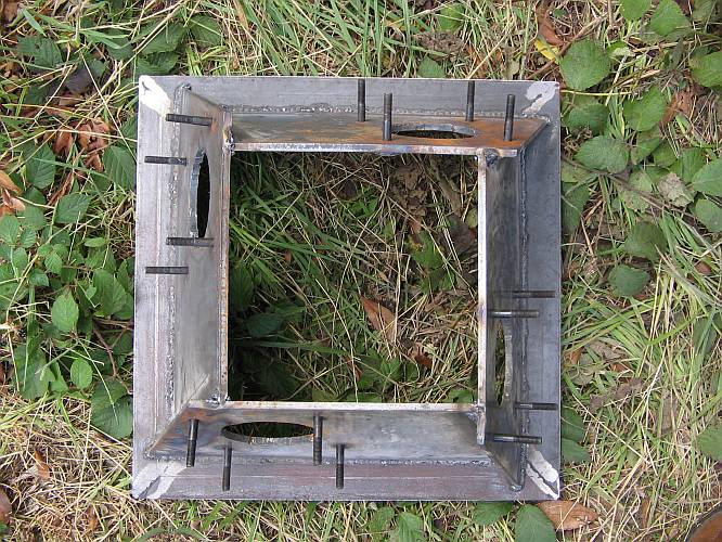 This turbine case will mount on the frame at left, which in turn will be cemented in. The bolts are welded to the structure.