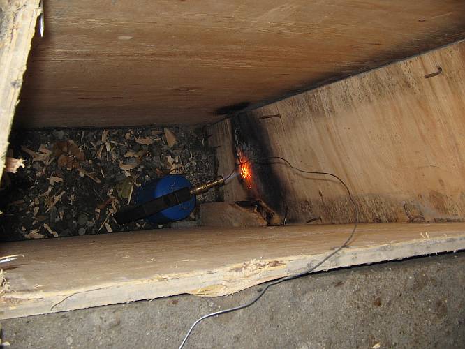 Provisionally the transformer was seated on some wooden pieces, to keep it clear of possible minor flooding. The conduits with the high voltage wires were fixed in such a position that in the event that condensation accumulates and drips out, it won't drip onto the transformer. Also, the wires have drip loops and are in free air, so that there is no insulation problem. But anyway, at only 1000V each against earth, insulation isn't really a problem. The center tap of the high voltage winding is grounded.