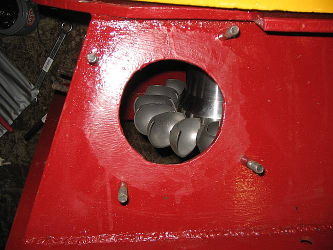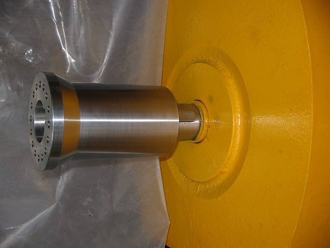 Looking from "below". Once assembled, a bolt with large washer will hold the runner to the axle. This same hole is threaded with a larger thread (which was funnily forgotten by the machinist in Santiago, and had to be made in Temuco later!). Using this thread, a long bolt can be inserted and used as extractor when the runner has to be taken off the generator for bearing maintenance.