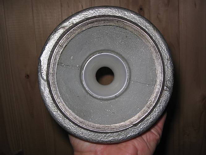 Here you can see a detail of how the nipple protrudes deep into the collar, where later the plastic penstock will be. I solved this problem by grinding off the protruding parts, after taking this picture.