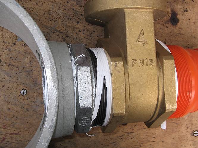 Unfortunately the collars and nipples are of horrible quality. The collars are cast aluminium, terribly porous, almost as bad as the concrete of my forebay... The threads seem to be made in casting. And the nipples are zinc dipped cast iron. This material is brittle, and many chunks of the threads are simply missing. On top of that, the threads of the nipples are far smaller than the specs require, so they screw fully into the collars before their tapers even start to adjust. The valves have better threads, but very much shorter than the minimum required by the specs of the BPST thread. They fit the nipples so loosely that they almost fall off! I tried to wind on an almost grotesque amount of teflon tape, and assembled the stuff, but I fully expect these assemblies to leak everywhere. If the leaks are not too bad, I just will build dams and canals in my powerhouse to channelize the leak water away... but if they spray all over the place, I will have to find another solution. Suggestions are welcome.