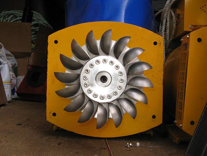 The machined pieces for the turbine runner are the best made parts of the whole system. They were made from stainless steel in Oscar Quijon's workshop in Santiago, to my design. Here you can see the main piece, mounted on the generator axle.