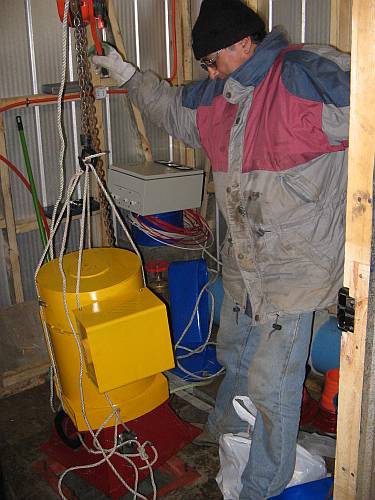 And here it is, in the machine room, dangling from the hoist, with the turbine already attached!