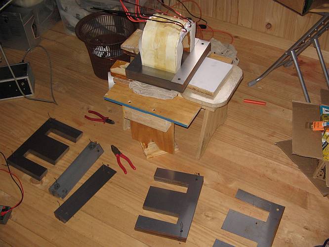 The E-I laminations measure 30x25cm, and the full stack (for the two transformers) is a bit more than 30cm high. Don't let these low numbers fool you: The steel weighs no less than 140kg! And there are 55kg of copper wire, but not all of the wire was used. Only about 80%.