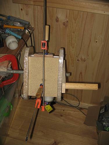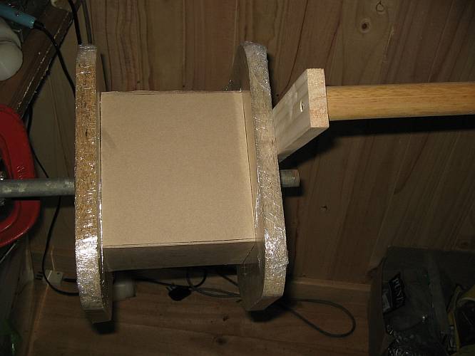 I built this wooden mold for the water outlet duct of the power house. It will have a larger opening for the turbine, and a smaller one that can be used as a general sink, or for a second, smaller "summer" turbine.
