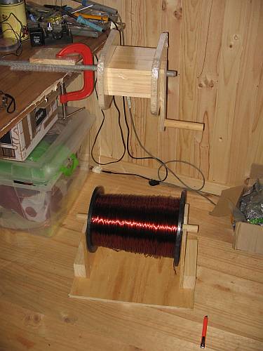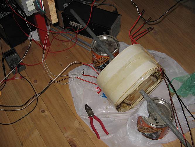 With the turbine running smoothly, it was time to make the transformers, to be able to transport the full power to the house. The 600 meter long line was designed to have low loss when operating at 2000 volts. At 230V, the losses are extremely high at anything over a few hundred watts. So, here I go...