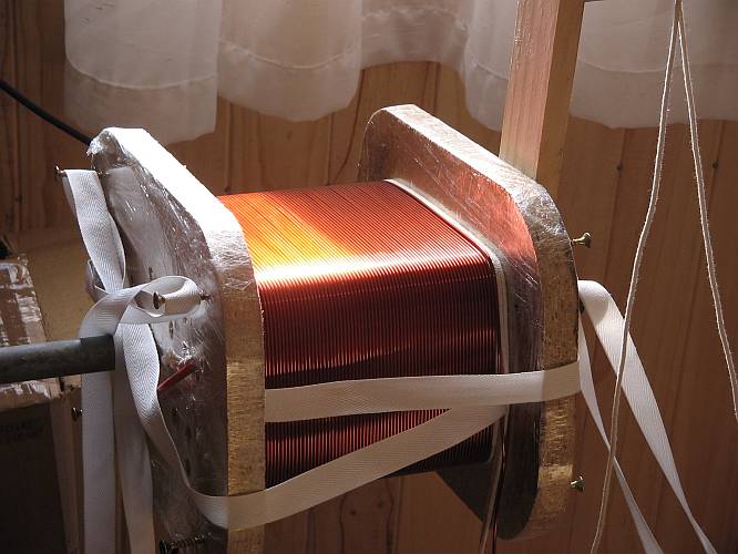 The first layer of the high voltage winding is ready. Cotton rope is used on each side to keep the wire from getting near the edges. This rope is later removed. The flat cotton straps instead, which bind the wire turns together and keep the whole thing from falling apart once the form is removed, remain in place.