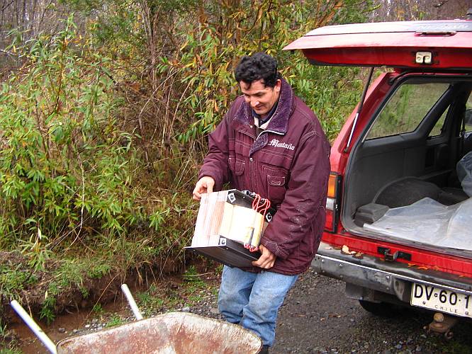 After finishing the second transformer, the big job that remained was moving one of the transformers down to the machine house. My friends from Temuco were planning to come over and help me, when suddenly, out of the blue, my long missing neighbor Gabriel showed up. He had heard the turbine running (it's right across the fence from his property), and seen the outflow, so he knew it was finally running, and wanted to see it in detail, to enjoy at least a little bit of satisfaction from his hard work. I told him about the transformers, and he proposed to immediately bring down one of them. Why not? So I went for my pry bar, to use it to carry the transformer, which at its 92kg of weight can be carried by two people without too much trouble. But Gabriel will ever be Gabriel. "92 kilos? I can carry that alone! Don't bother with your pry bar." And so he did!