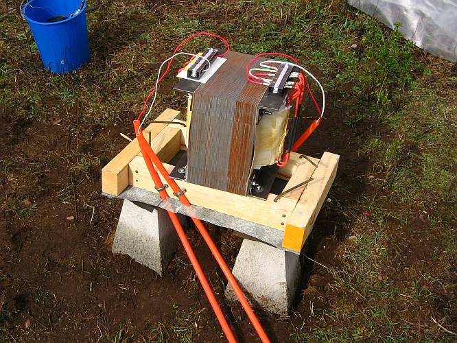 The other transformer was installed on a small wooden pad on concrete blocks, next to my little cabin. Later it will be installed indoors in the definitive round house.