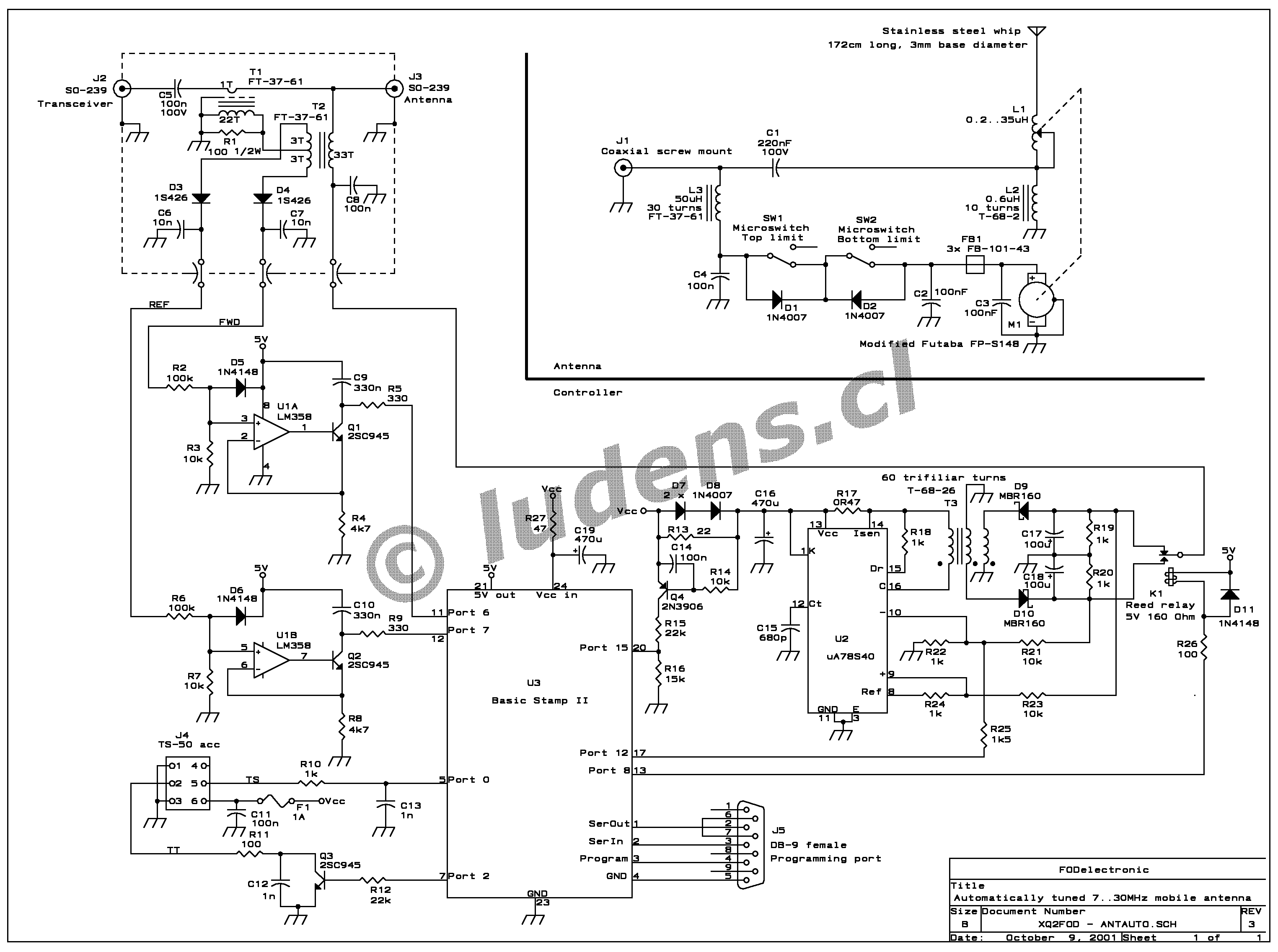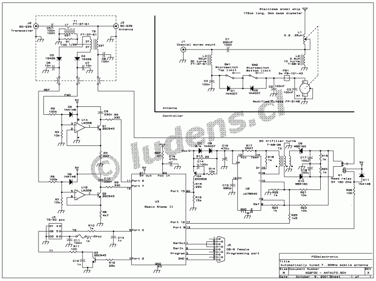A DB9 connector is also provided, which allows connecting a PC, both for programming the Basic Stamp, and for reading status messages during the testing phase of the antenna. This connector is not needed once the unit is ready, and could well be fitted in a temporary fashion.