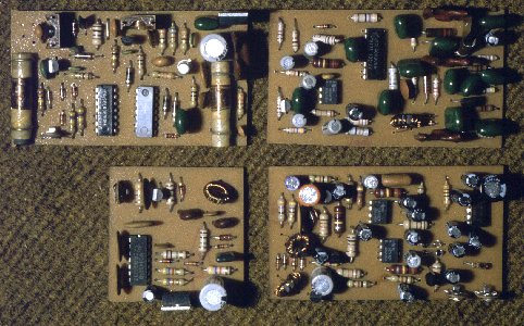 This radio was built on a style of crude circuit board: I cut a piece of chipboard, glued small scraps of copper foil to it, and soldered the components to those copper spots. I must confess, I had not yet discovered that it was allowable to cut the leads of the parts, so every resistor and every capacitor was soldered with full lead length! The IC pins were soldered to wires, to make them long enough. It was a mess, but it worked! Unfortunately I have no photo of it...