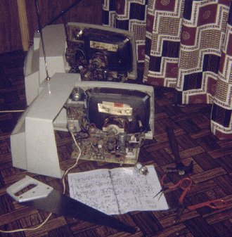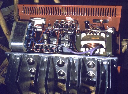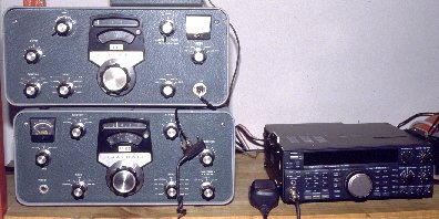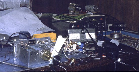 The large open chassis is a tube-type linear amplifier. It started out with two 2E26 valves, but they were just too small. I soon replaced them by a pair of 6146Ws. Powered by 1.2 kV, they ran nicely at the 300 Watt level, driven by the tiny 1 Watt output from my QRP rig!