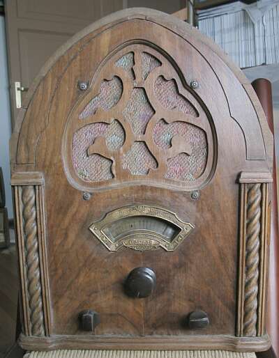know anything about it, please tell me! My address is Someone scraped the original finish away with glass shards or similar harsh tools, leaving the wood all scratched, and then applied a very thin cover of something that looks like spray varnish. There's a badly made veneer implant on the right side. It seems that the columns and moldings were originally painted dark brown, and the rest was lacquered in natural tone, according to the residues of original finish I can find. The grille fabric is non-original. The largest problem for restoration will be the missing veneer around the top arch. I don't know yet how I will fix this...