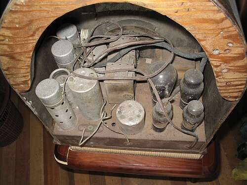 The radio has eight tubes, of the 2.5 Volt series. The tubes are 58-56-58-58-2A6-76-47-80. It seems to be a primitive superheterodyne with RF stage and separate oscillator, and I would date it to maybe 1931 to 1933.