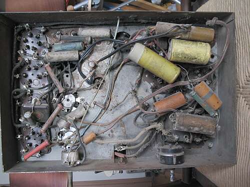 The tube complement is similar to some Zeniths. The variable capacitor has no brand name nor other printing at all, but several other parts bear labels indicating their origin in New York or near that city.