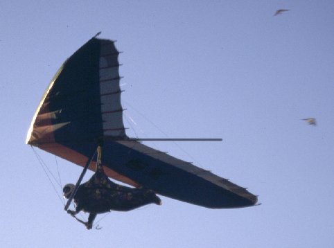 I did many more such short flights that morning, from higher and higher up the idiot's hill. On the last ones Jens told me to try some slight deviations from the straight course. I felt quite in command and maneuvered around the thorny bushes that crowd the area, without touching them. The class continued until I was simply too tired to again climb up the hill...