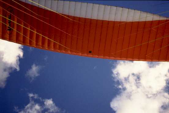 This photo may give you an idea of how the wing looks from the pilot's sight. Actually, I shot this photo by holding the camera in front of me, and pointing it straight up. When making photos, I hold the camera with my left hand, while the right one has to hold both brakes, and the throttle. I slightly pull on the brakes, so that by sideward displacement of the control hand I can do a limited amount of directional control, since both brake lines start from an already tensed position. Also, the slight tension helps stabilize the canopy against tucks that may happen when hitting some turbulence. That said, I must also say that the relatively high loading of my wing makes it extremely resistant to such tucks. Even in quite rowdy air, I have seen it shaking quite a lot, without ever tucking.