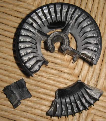 But I'm not inclined to throw away a machine consisting of a powerful motor, electronic controller, belt drive, gear train, several ball bearings, housing, and lots of other stuff, just because a ridiculous plastic fan broke after 50 hours of use! Even the carbon brushes were still like new! So I went to the store where I had bought the machine, to ask for help.