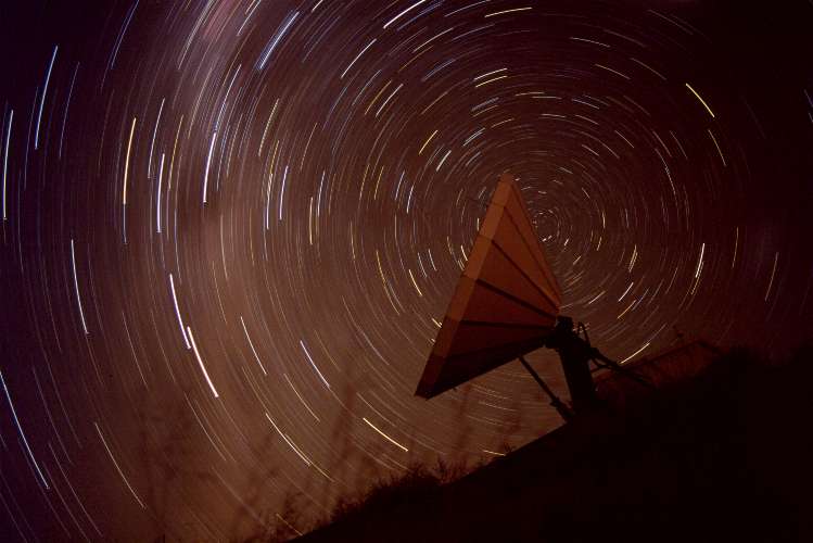 south pole behind an Intelsat antenna, in a very dark night. The reddish