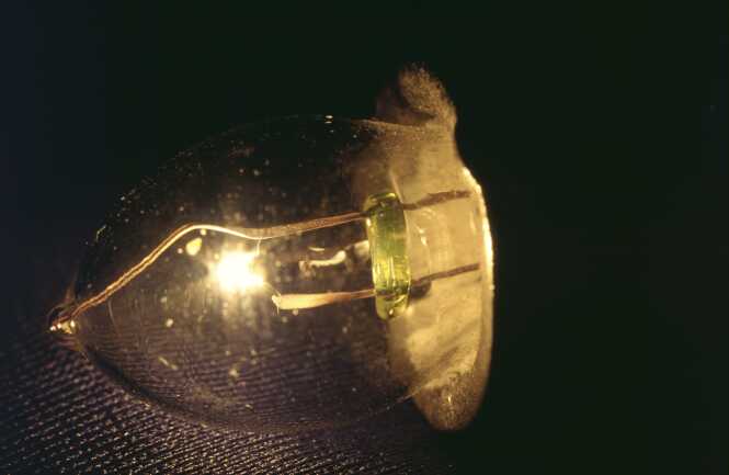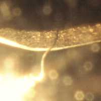 This flashlight bulb lit itself for the test photo. This is actually not a macro shot, but a micro one! The image size on the film is larger than the original. Depth of field is a real problem with such work, thus the very small aperture used. With the extension, the f/16 set on the lens is an even smaller true aperture. SInce the field produced by a lens in this configuration is much larger than the frame, sharpness doesn't change significantly over the frame. Thus I included only one detail scan. |