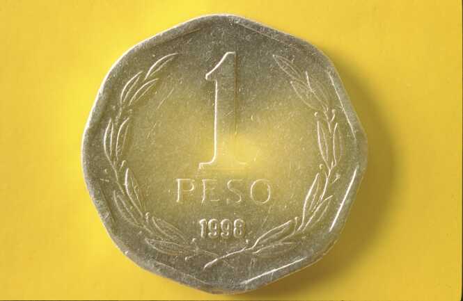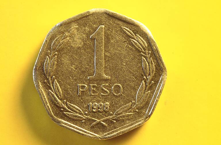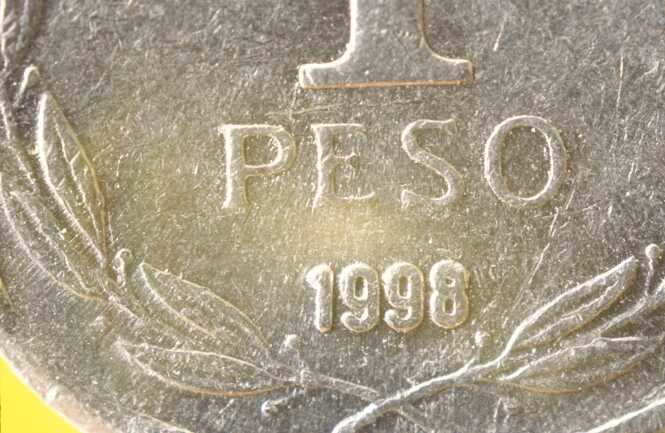 This is the smallest coin currently circulating in Chile. It measures 16mm in diameter. The light spot at the center, with X-shaped arms, has me puzzled. It seems to be light from outside the field, reflecting inside the bellows, camera, and then somehow converging into a spot, probably on the lens. But the X??? It's slight in this photo, but worse in some others! |