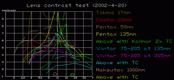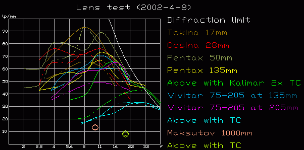 This graph can give good advice at how to use the lenses. It's clear that the 17mm should be used at f/8 whenever practical, the 135mm at f/11, and when the latter is combined with the teleconverter it should be set at f/8, giving a true f/16. The 28mm and 50mm lenses provide good performance over the range of f/4 to f/11, giving more room for creativity than the other lenses. Unfortunately the graph also shows that the 1000mm lens is unsuitable for serious photography because of its very low resolution, and that the same is true, to a lesser extent, for the zoom/teleconverter combination.