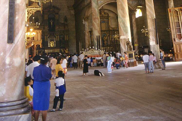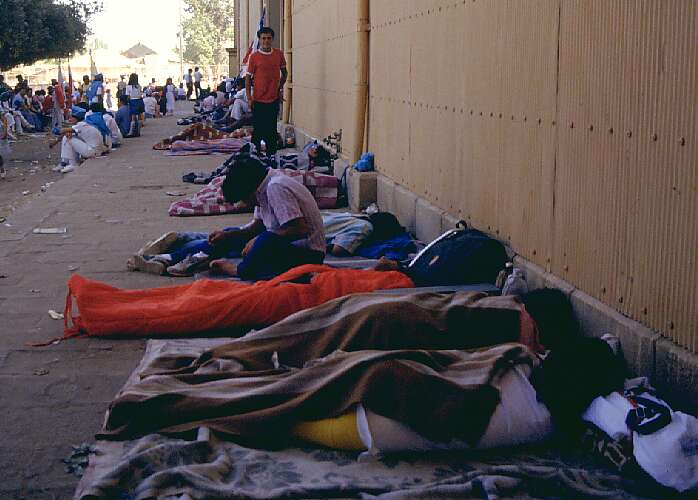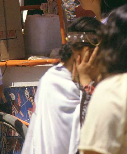 Some people are reluctant to be photographed, and hide their faces. I got a few photos in which people who took this attitude were recognizable, and those photos I did not publish in order to respect their position. This image, scanned out of the background of a slide, I picked out as an example for this page, given that the lady hid her face so well that nobody could possible recognize her...