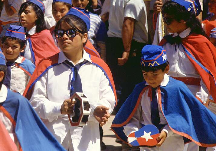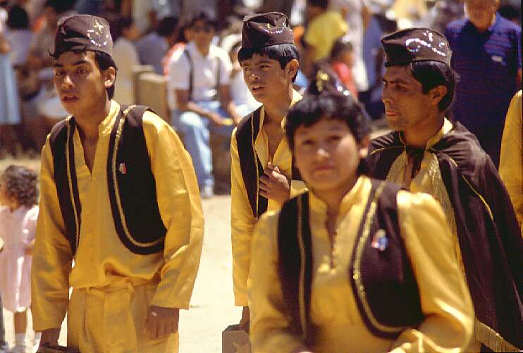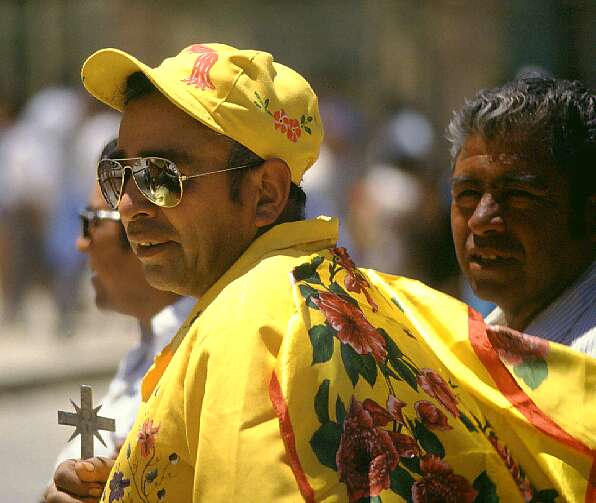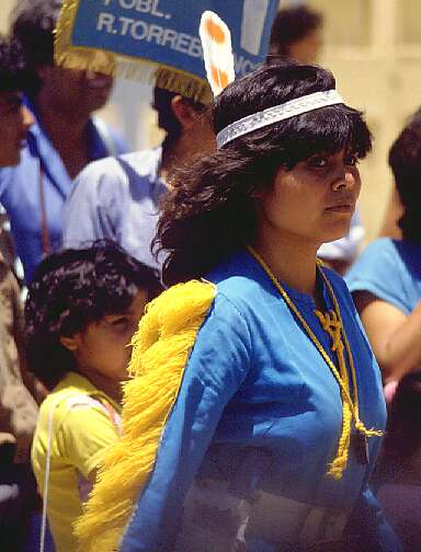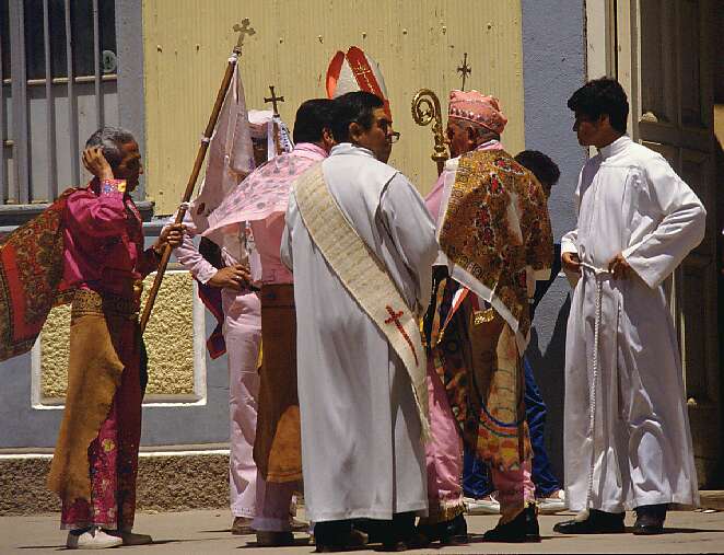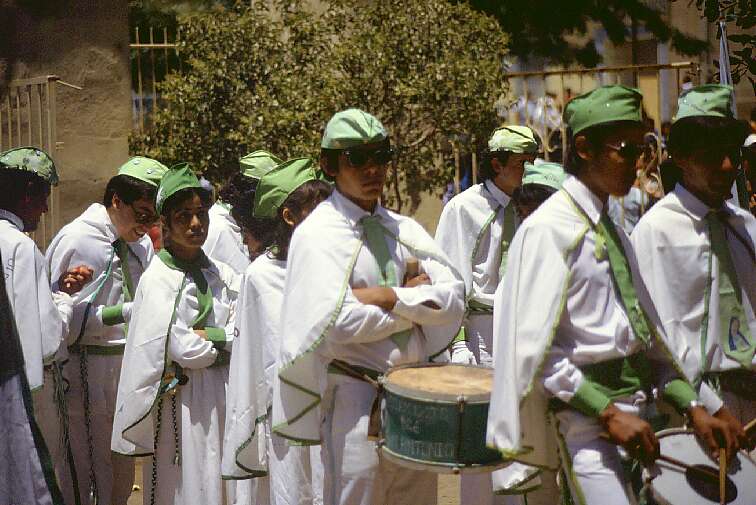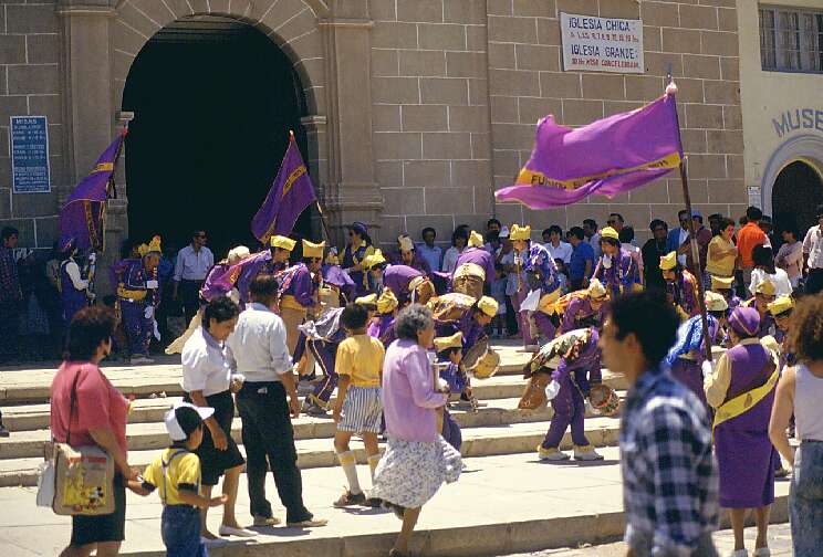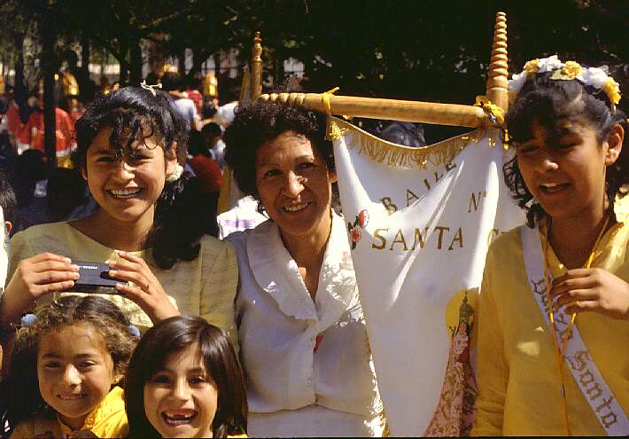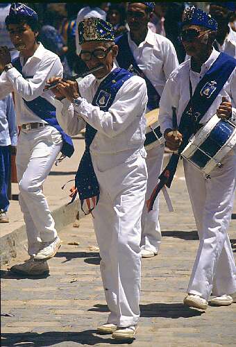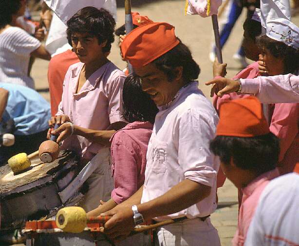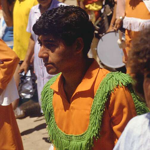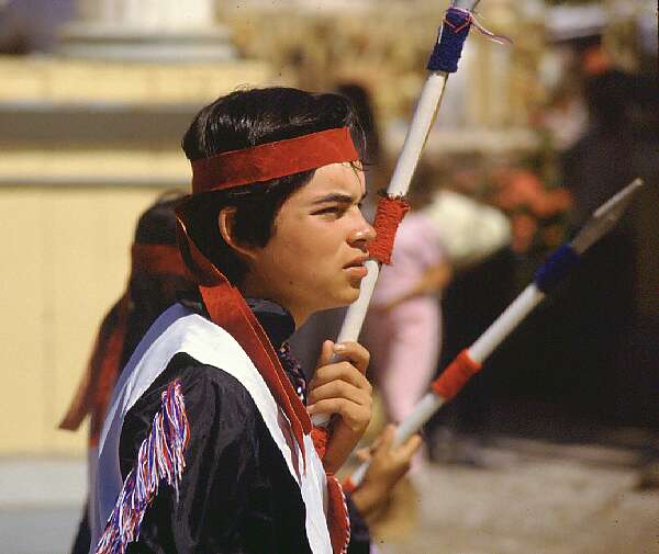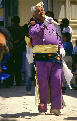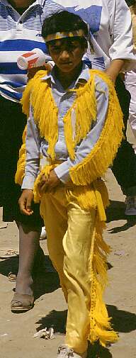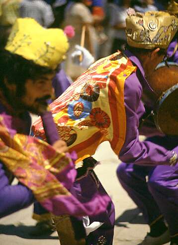 Later than the Chinos, other dance styles appeared, like the Turbantes and the Danzantes. Within these, often exotic models find their entrance, like the dancer on the right in a dress fashioned after some North American indians. The music of these groups is less archaic than that of the Chinos, covering the range from melodic marching music to intense rhythms played on loud percussive instruments.