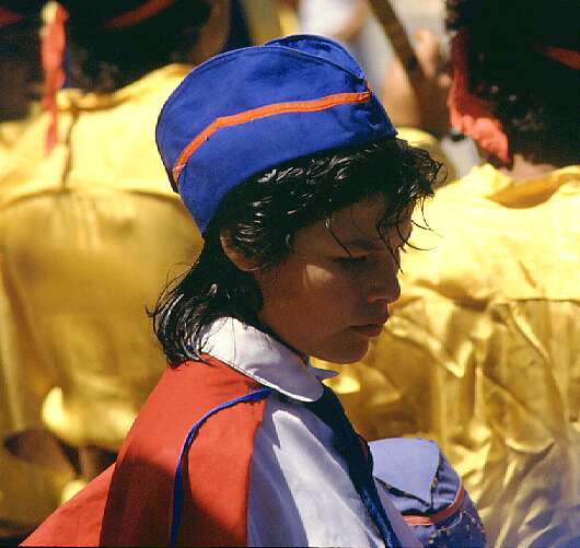 The Chinos form several brotherhoods, clearly distinguished by their colors. At first sight, their dances seem to be the same, but closer examination shows that each group does have its own details, its own customs and traditions that have evolved over centuries and been handed down from father to son, from grandfather to grandson. Family tradition is strong in the dance brotherhoods, but new members can also be accepted if their desire to take part is true and they are willing to hold the traditions high.