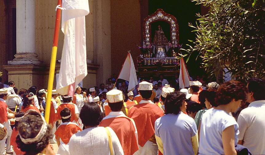 The culmination of the celebration comes when the many dance groups are finally allowed to perform their dances in front of the holy image. Since there are so many dance groups, each is allowed a strictly limited time to perform. There is often fierce competence for the time slots, which are normally assigned by time of arrival in Andacollo. This is the time when the crowd is densest, and photography is possible only by raising the camera above one's head!