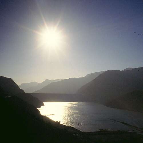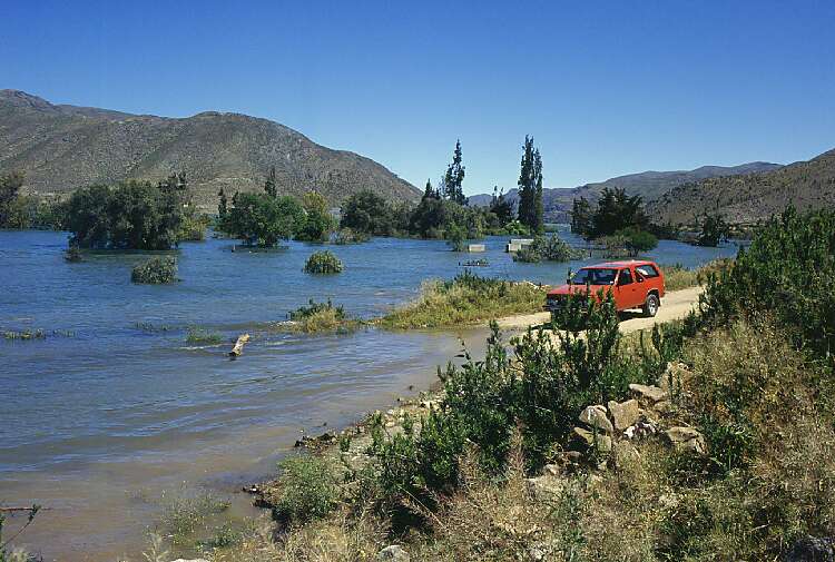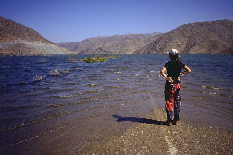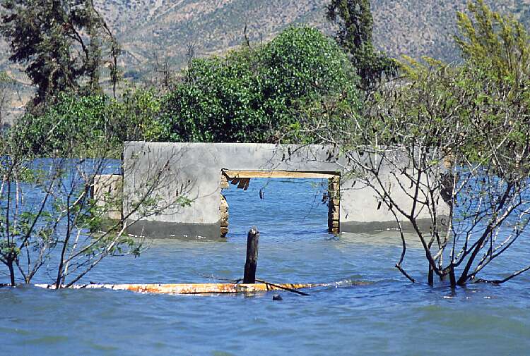 January 2003. The summer heat has been melting the winter's snow in the mountains, filling the new lake to the brim. This is as high as the water can get. Nothing of the old town remains, only the tips of the tallest trees still look out of the water. The road is just a few meters above the water. Old Gualliguaica is no more.