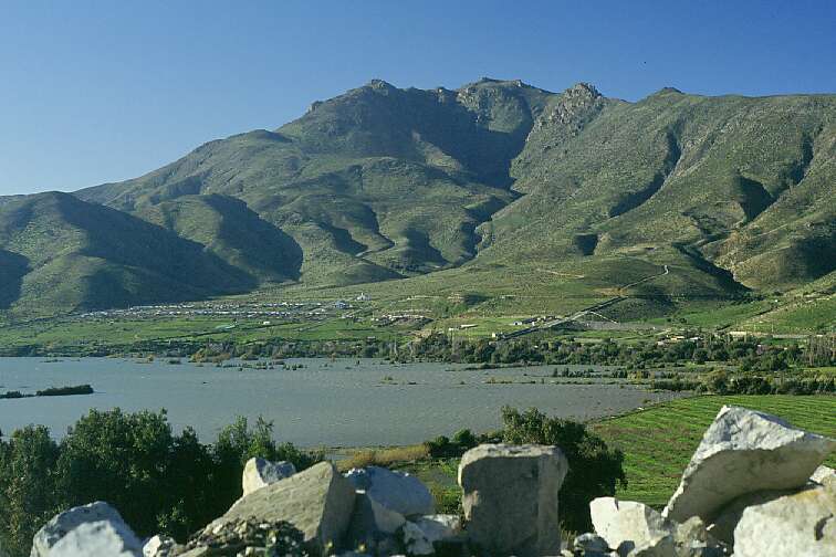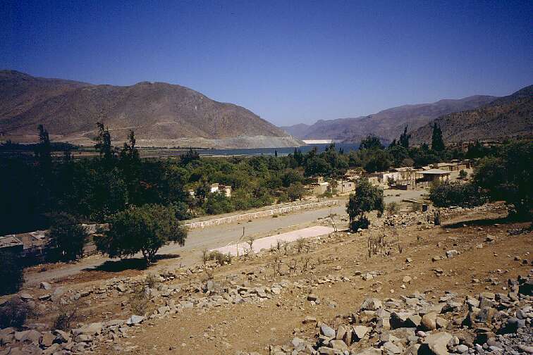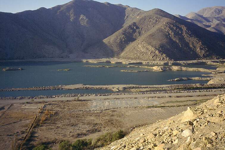 This is the area that was chosen for the Puclaro dam. The valley has a narrow section here, so that it was feasible to build the dam. The land that would be inundated was mostly being used for growing grapes; people were resettled and got paid for their land. The major problem were two towns that would end up under the water. The dam builders agreed to rebuild these towns at what would become the shoreline of the new lake.
